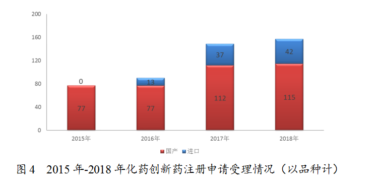 藥審中心受理1類化藥創(chuàng)新藥注冊(cè)申請(qǐng)157個(gè)品種,整體較2017年略有增加,其中受理創(chuàng)新藥NDA 16個(gè)品種,較2017年增長(zhǎng)了一倍。2018年受理的157個(gè)化藥創(chuàng)新藥注冊(cè)申請(qǐng)中,國(guó)產(chǎn)化藥創(chuàng)新藥注冊(cè)申請(qǐng)為115個(gè)品種,進(jìn)口化藥創(chuàng)新藥注冊(cè)申請(qǐng)為42個(gè)品種,2015年至2018年創(chuàng)新藥注冊(cè)申請(qǐng)受理情況詳見(jiàn)圖4。
