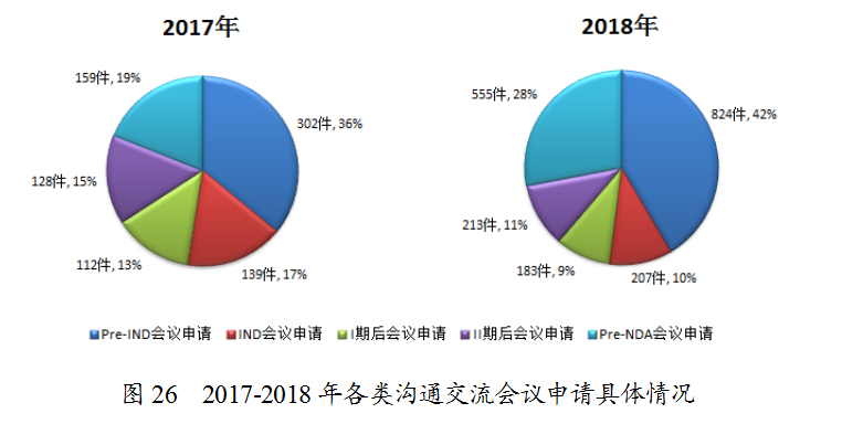 2018年收到溝通交流會(huì)議申請(qǐng)1982件,其中Pre-IND會(huì)議申請(qǐng)和Pre-NDA會(huì)議申請(qǐng)占比例較多,分別為42%和28%。與2017年比較,Pre-IND會(huì)議申請(qǐng)和Pre-NDA會(huì)議申請(qǐng)所占比例增長(zhǎng)較明顯,2017至2018年各類溝通交流會(huì)議申請(qǐng)具體情況見(jiàn)圖26。