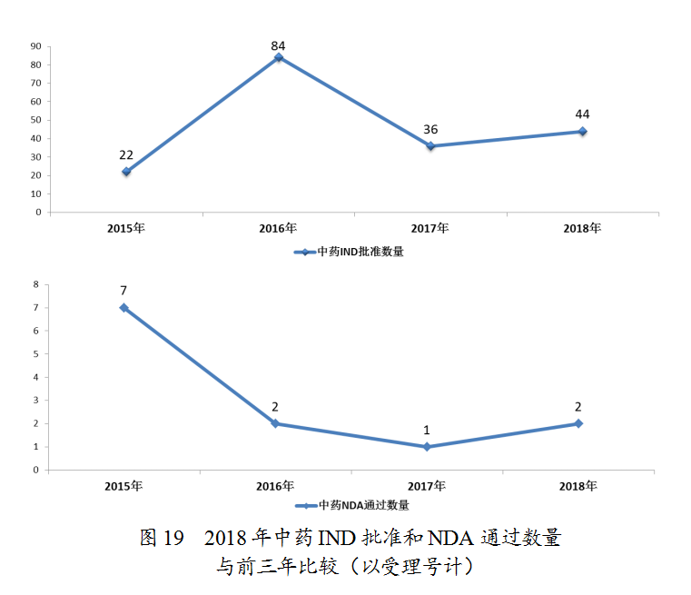 藥審中心審評(píng)通過(guò)批準(zhǔn)中藥IND申請(qǐng)44件;審評(píng)通過(guò)中藥NDA 2件(涉及2個(gè)品種,關(guān)黃母顆粒、金蓉顆粒)。完成審評(píng)的中藥各類注冊(cè)申請(qǐng)具體情況詳見(jiàn)表2,中藥IND批準(zhǔn)和NDA通過(guò)量與前三年比較(以受理號(hào)計(jì))詳見(jiàn)圖19。
