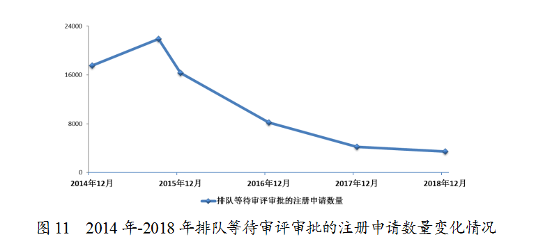 2018年底排隊(duì)等待審評(píng)審批的注冊(cè)申請(qǐng)已由2015年9月高峰時(shí)的近22000件降至3440件(不含完成審評(píng)因申報(bào)資料缺陷等待申請(qǐng)人回復(fù)補(bǔ)充資料的注冊(cè)申請(qǐng)),進(jìn)一步鞏固了44號(hào)文件要求解決注冊(cè)申請(qǐng)積壓的成效。2014年-2018年排隊(duì)等待審評(píng)審批的注冊(cè)申請(qǐng)數(shù)量變化情況詳見(jiàn)圖11。