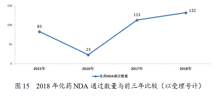 藥審中心完成審評(píng)的化藥NDA 206件,其中審評(píng)通過(guò)132件,與前三年比較(以受理號(hào)計(jì))詳見(jiàn)圖15,2018年完成審評(píng)的化藥各類注冊(cè)申請(qǐng)具體情況詳見(jiàn)表1。
