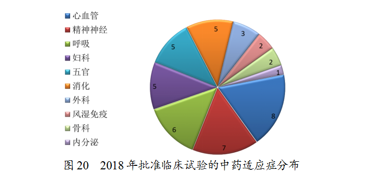 藥審中心審評(píng)通過(guò)批準(zhǔn)臨床試驗(yàn)的中藥IND申請(qǐng)44件,涉及10個(gè)適應(yīng)癥領(lǐng)域,其中心血管、精神神經(jīng)、呼吸較多,共占48%,具體治療領(lǐng)域分布詳見(jiàn)圖20。