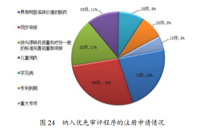 根據(jù)國(guó)家食品藥品監(jiān)督管理總局(以下簡(jiǎn)稱原總局)《關(guān)于鼓勵(lì)藥品創(chuàng)新實(shí)行優(yōu)先審評(píng)審批的意見(jiàn)》(食藥監(jiān)藥化管〔2017〕126號(hào)),2018年,藥審中心共將313件注冊(cè)申請(qǐng)納入優(yōu)先審評(píng)程序,其中兒童用藥和罕見(jiàn)病用藥63件。2018年納入優(yōu)先審評(píng)的注冊(cè)申請(qǐng)中,同步申報(bào)的品種占比最大,占比為28%,其次為具有明顯臨床價(jià)值的新藥,占比為23%。納入優(yōu)先審評(píng)程序的注冊(cè)申請(qǐng)情況詳見(jiàn)圖24。