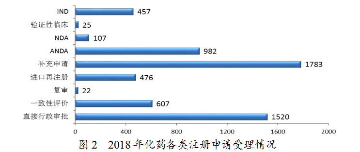 2018年,藥審中心受理的7336件新注冊(cè)申請(qǐng)中,化藥注冊(cè)申請(qǐng)受理量為5979件,占2018年全部注冊(cè)申請(qǐng)受理量的82%,2018年各類藥品注冊(cè)申請(qǐng)受理情況與近三年比較詳見(jiàn)圖1。