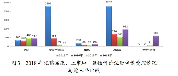 藥審中心受理化藥注冊(cè)申請(qǐng)共5979件,其中受理化藥NDA申請(qǐng)107件,較2017年增長(zhǎng)了43%;受理仿制藥上市申請(qǐng)(ANDA)982件,較2017年增長(zhǎng)了79%?;幐黝愖?cè)申請(qǐng)受理情況詳見(jiàn)圖2。2018年化藥臨床、上市和一致性評(píng)價(jià)注冊(cè)申請(qǐng)受理情況與近三年比較詳見(jiàn)圖3。