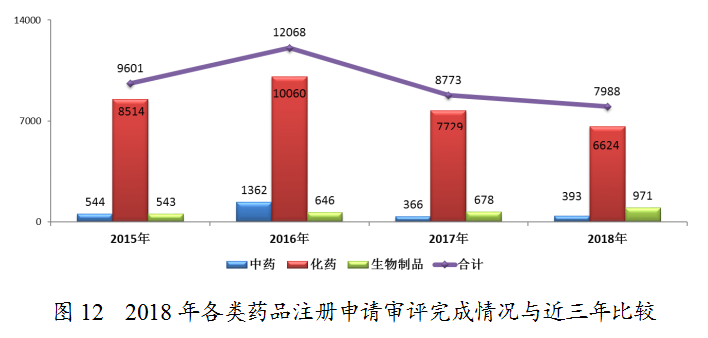 完成審評(píng)的申請(qǐng)中,化藥注冊(cè)申請(qǐng)為6624件,約占全部審評(píng)完成量的83%。2018年各類藥品注冊(cè)申請(qǐng)審評(píng)完成情況與近三年比較詳見(jiàn)圖12。