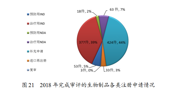 藥審中心完成審評(píng)的生物制品注冊(cè)申請(qǐng)共971件,其中完成預(yù)防用生物制品IND申請(qǐng)(預(yù)防用IND)53件,完成治療用生物制品IND申請(qǐng)(治療用IND)377件,完成預(yù)防用生物制品NDA(預(yù)防用NDA)18件,完成治療用生物制品NDA(治療用NDA)63件。完成審評(píng)的生物制品各類注冊(cè)申請(qǐng)情況詳見(jiàn)圖21。
