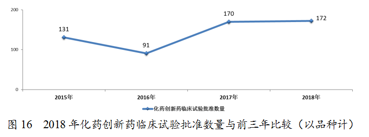 藥審中心完成審評(píng)的化藥IND申請(qǐng)603件,審評(píng)通過(guò)批準(zhǔn)IND申請(qǐng)554件,其中批準(zhǔn)1類創(chuàng)新藥臨床試驗(yàn)申請(qǐng)449件(涉及172個(gè)品種)。1類化藥創(chuàng)新藥臨床試驗(yàn)批準(zhǔn)數(shù)量與前三年比較(以品種計(jì))詳見(jiàn)圖16。