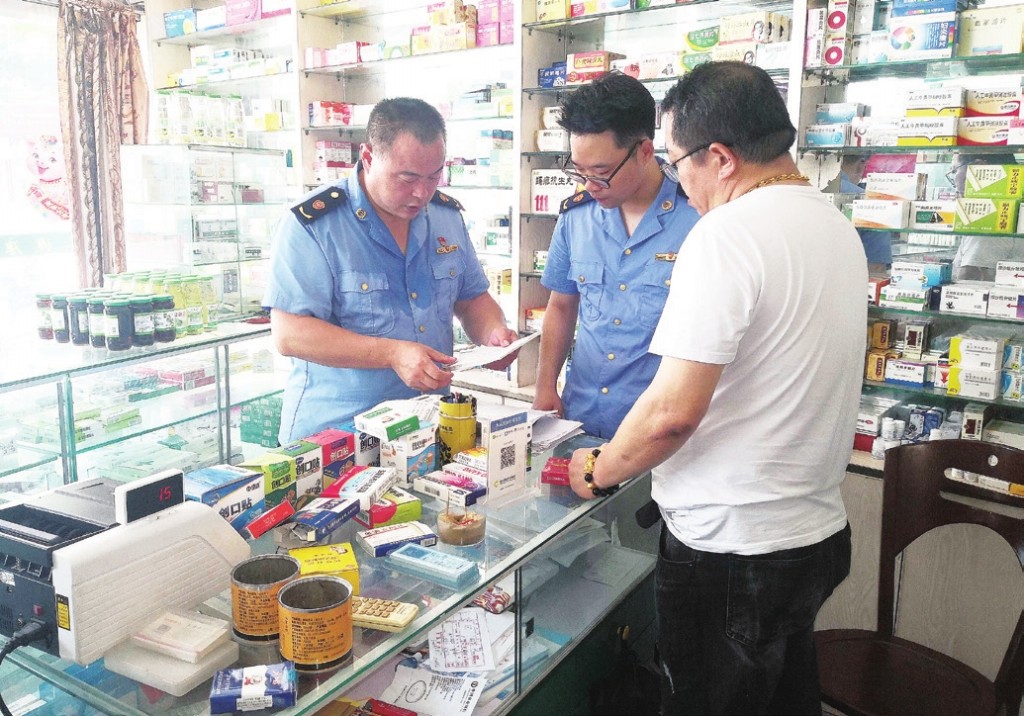 圖為執(zhí)法人員在一家藥店檢查藥品驗(yàn)收記錄。汪曉秋 攝