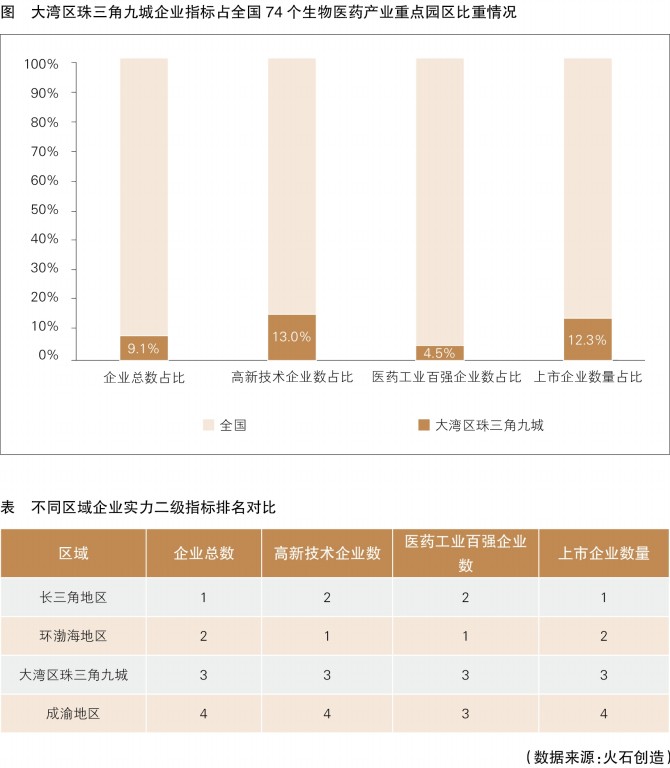 目前全國主要有4個生物醫(yī)藥集聚區(qū),分別是長三角地區(qū)、環(huán)渤海地區(qū)、大灣區(qū)珠三角九城和成渝地區(qū)。其中,大灣區(qū)珠三角九城整體實力位居第3,擁有7個重點園區(qū)、2個成分園區(qū),企業(yè)實力和創(chuàng)新能力位列全國第3和第4位。