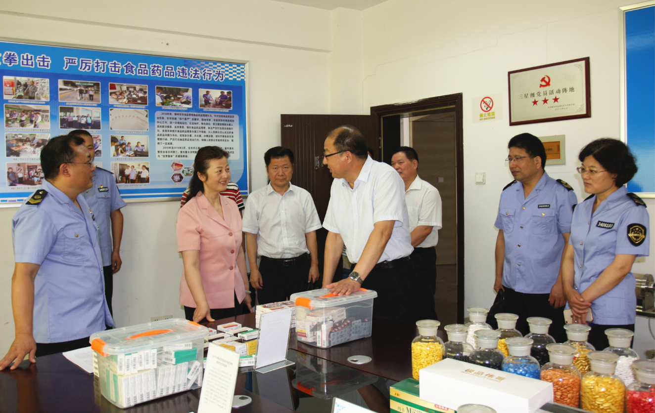 圖為安徽省藥品監(jiān)督管理局黨組書(shū)記、局長(zhǎng)吳麗華一行在滁州市市場(chǎng)監(jiān)督管理局調(diào)研藥品排查打假情況。蔣守福 攝