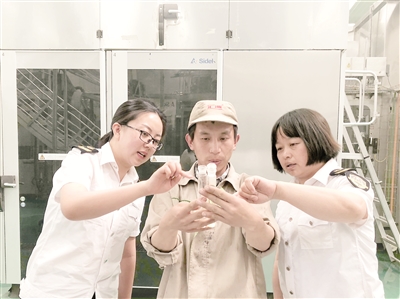 圖為執(zhí)法人員在檢查某飲用水生產(chǎn)企業(yè)水樣/攝影 王晶晶