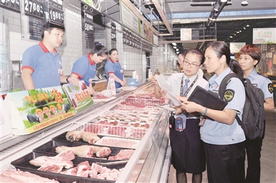 圖為南寧市南湖街道食品藥品監(jiān)管所執(zhí)法人員在超市檢查肉類供貨商及經(jīng)營者持證經(jīng)營等情況/攝影 許恒