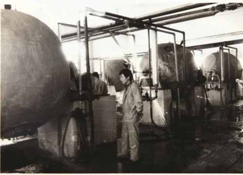 1977年,東阿阿膠人獨(dú)立研制第一臺(tái)蒸球化皮機(jī)。