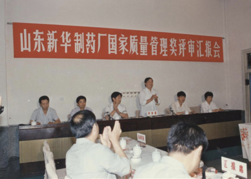1990年,國家質(zhì)量管理獎(jiǎng)評(píng)審匯報(bào)會(huì)現(xiàn)場。1990年9月,新華制藥獲得國家質(zhì)量管理獎(jiǎng),這是全國醫(yī)藥行業(yè)首塊國家質(zhì)量管理獎(jiǎng)牌。