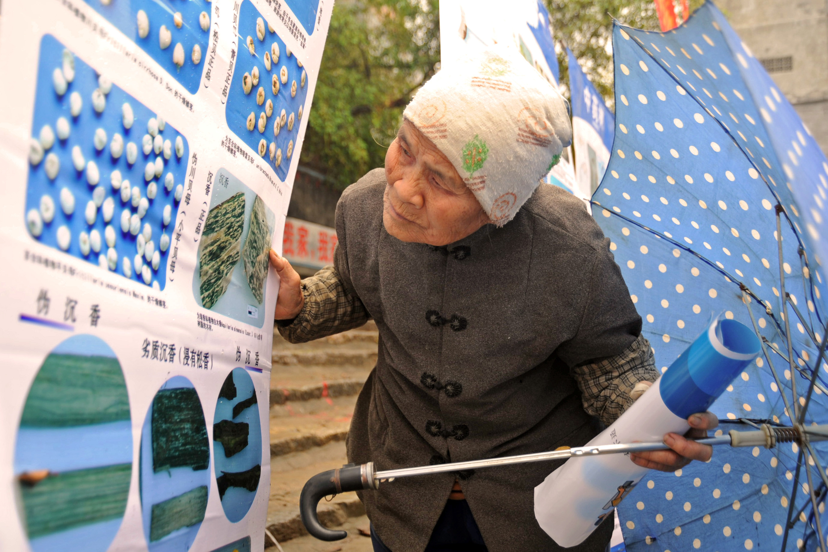 老大娘湊近假劣藥品圖片展板,想看個(gè)明明白白。