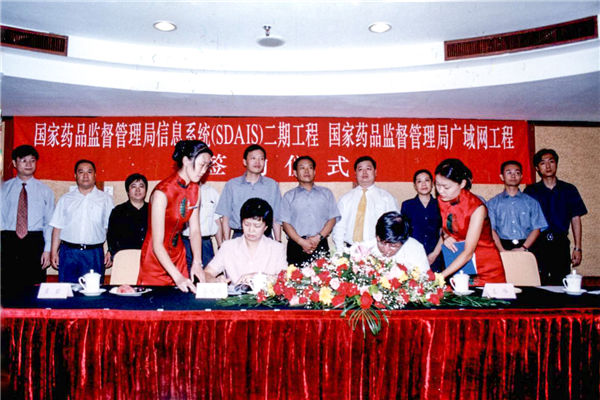 2002年國家藥品監(jiān)督管理信息系統(tǒng)(SDAIS)二期工程簽約儀式。